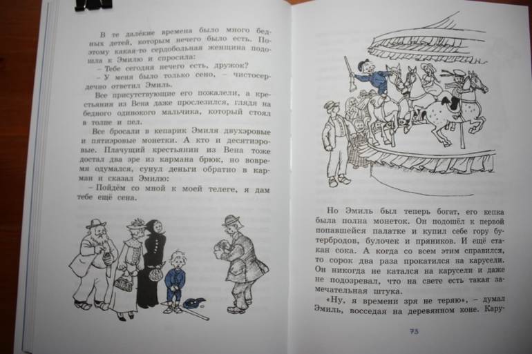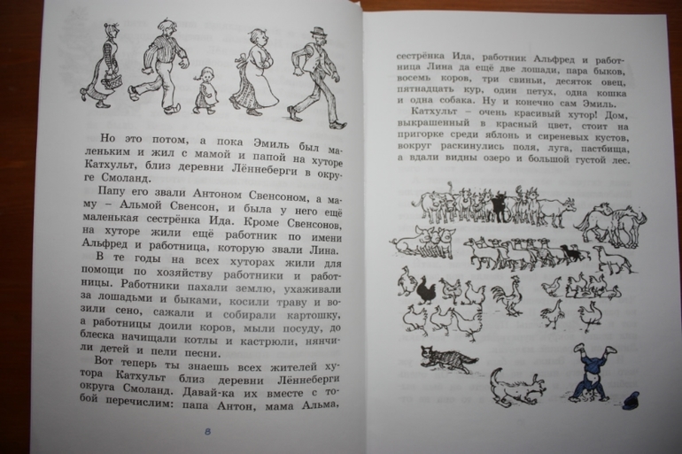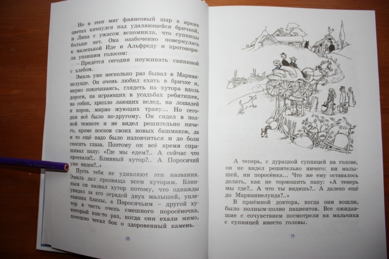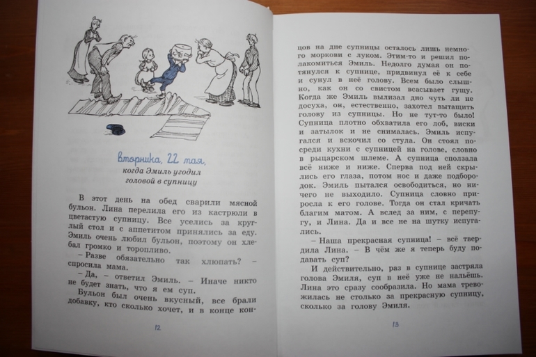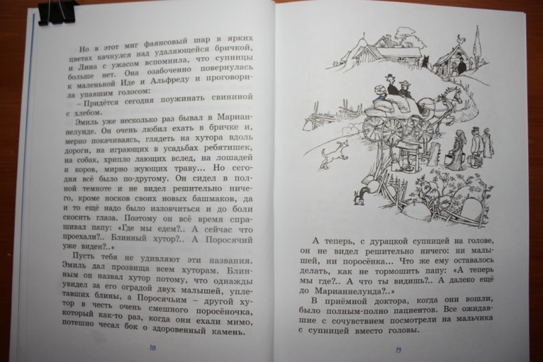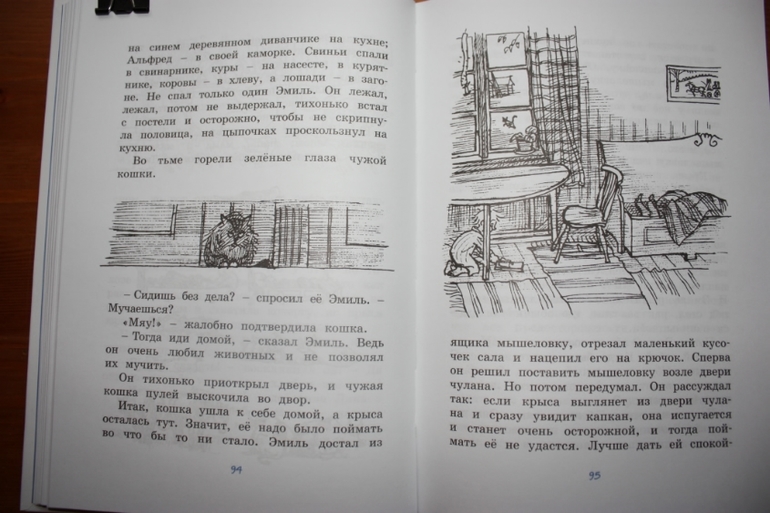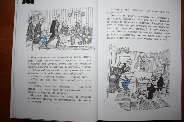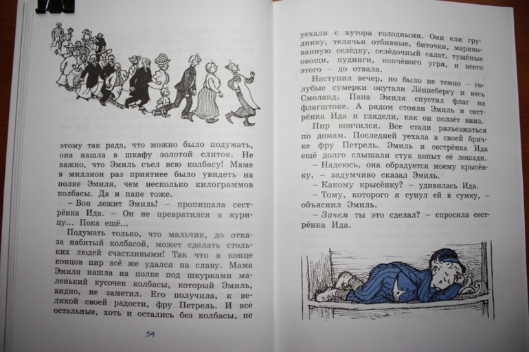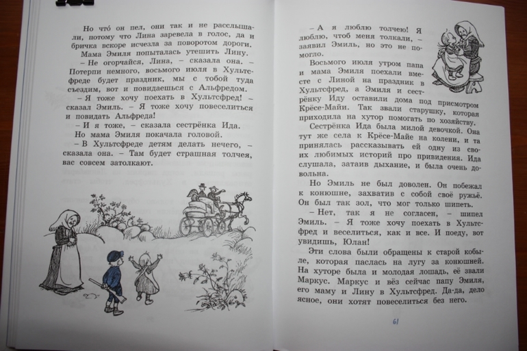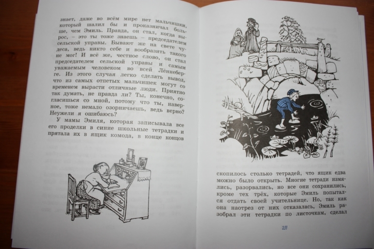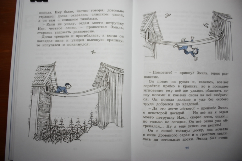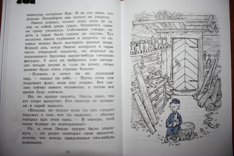 От проделок Эмиля он был просто в восторге. И очень беспокоился, когда мы читали последнюю главу: неужели Альфред не поправится, неужели Эмиль не успеет пробиться к доктору? А то, какие прекрасные и интересные фигурки выпиливал Эмиль сидя в сарае, вообще удостоилось крайнего ребёнкиного восхищения.