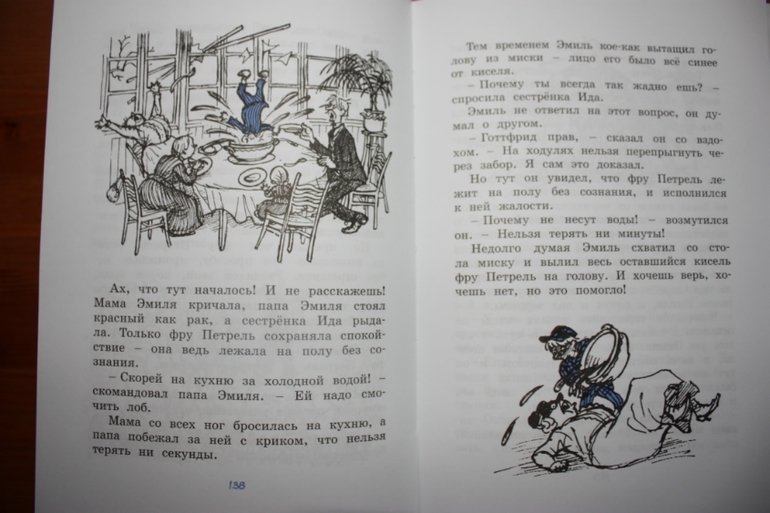 Как же я рада, что мы "дождались" издания с иллюстрациями Берга Бьёрна! Его чёрно-белые рисунки с цветным синим акцентом на Эмиле просто бесподобны! Они очень удачно дополняют повествование, при этом давая огромный простор для детской фантазии, чтобы разукрасить всё воображением. Сыну рисунки тоже очень нравятся. И их в книге много, редкий разворот обошёлся без иллюстраций, на многих можно увидеть по несколько рисунков сразу.