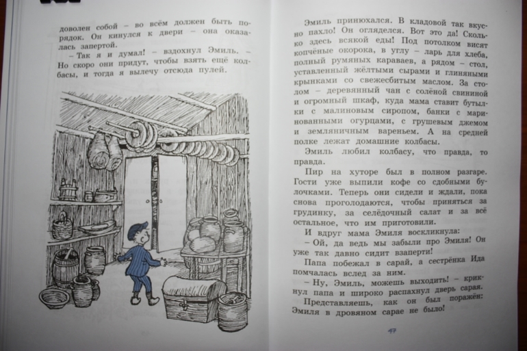 Сначала он негодовал, как это так родители запирают мальчика в сарае? А потом подумал и выдал: "Мама, как жаль, что у нас нет такого сарая! Тебе бы тогда совсем не пришлось меня ругать! Ты бы просто молча отводила меня в сарай, как мама Эмиля, и всё! Эх, как же всё-таки жалко, что у нас нету сарая!" - и это было сказано с такой тоской, с таким сожалением в голосе))))