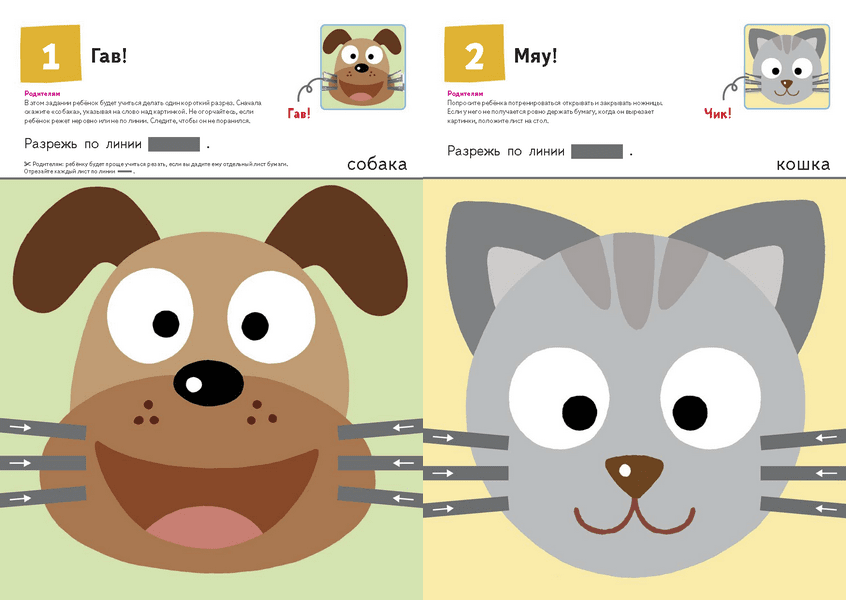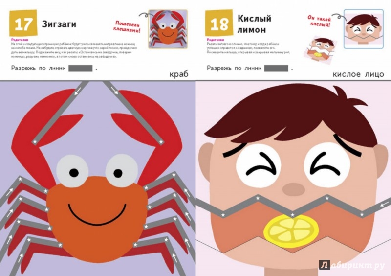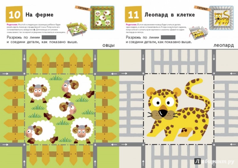 Выполняя задания, ребенок будет двигаться от простого к сложному. Сначала он будет резать бумагу по коротким прямым линиям, потом - по более длинным, после чего перейдет к зигзагообразным и изогнутым линиям. Упражнения в тетради постепенно развивают мелкую моторику ребёнка. С вырезанными картинками можно играть: собирать рисунки из частей или шевелить «лапками» животных. Детям это особенно нравится!