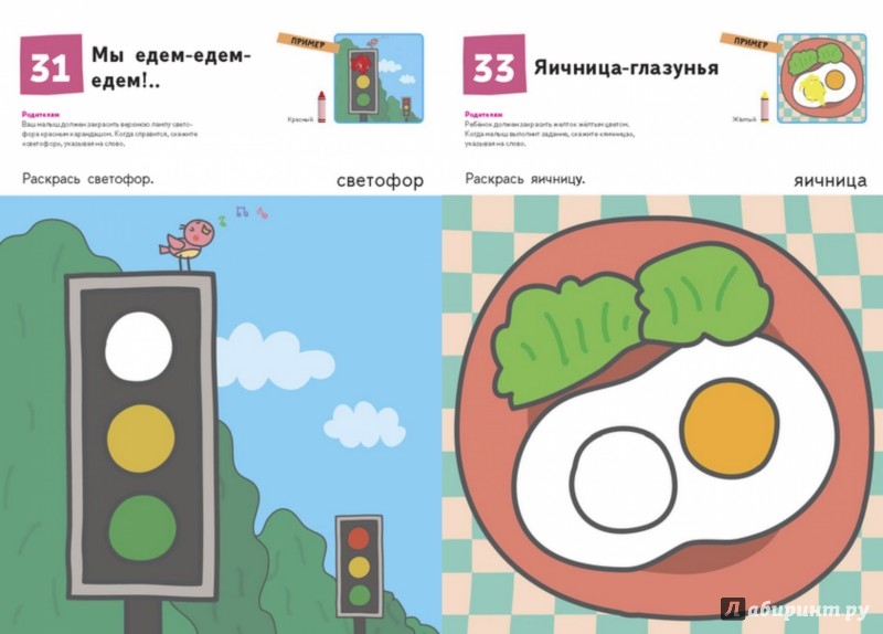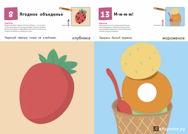 Выполняя задания, ребёнок будет двигаться от простого к сложному. Сначала он будет просто рисовать на картинках, привыкая правильно держать карандаш. Потом он научится закрашивать определённые участки рисунков разной формы и размера. Упражнения в тетради познакомят ребёнка с формами и помогут развить мелкую моторику, чувство цвета и творческие способности.