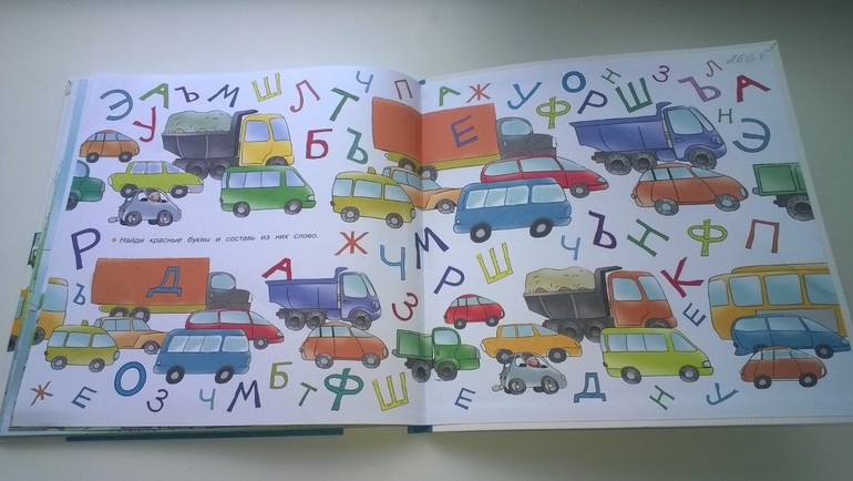 Для нас оказалось удобным что на первом форзаце алфавит показан полностью А на втором буквы разбросаны- их нужно искать.