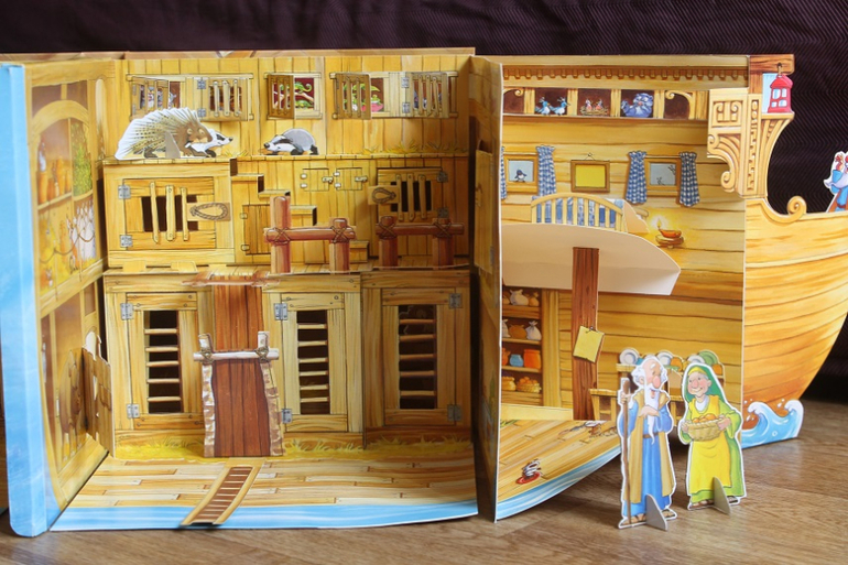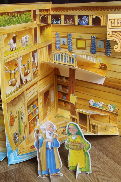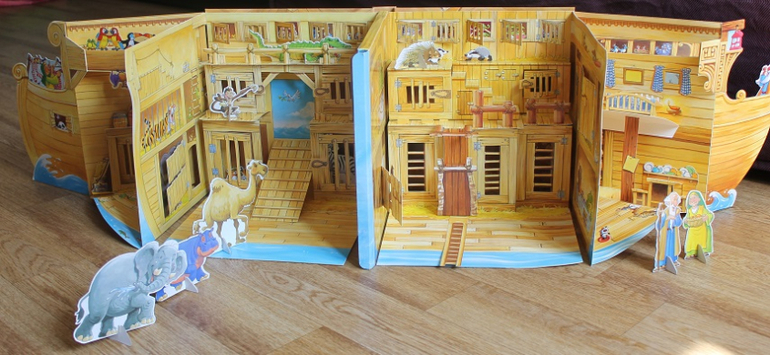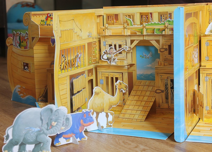 Историю о слоне из маленькой книжечки, вложенной в книжку-игрушку, мы прочитали быстро, так как были уже в предвкушении «плавания». Макет ковчега впечатляет даже взрослого: