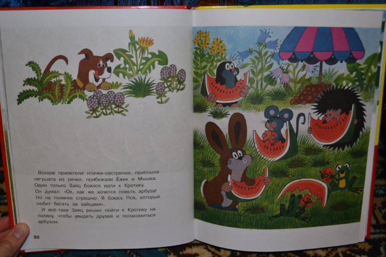 Книга у нас уже давно (хотя читать начали буквально недавно), и впечатления о ней, честно скажу, неоднозначные.Низкого качества страницы (тонкие, слегка шершавенькие, просвечивают), некоторые иллюстрации ужасны (как, например, слон на последнем фото), истории интересные и понятные ребёнку возраста моего сына, но при этом на такой возраст очень затянутые.Дима не выдерживает всю историю, читаем каждую за 3 захода!В целом, не понимаю ажиотажа вокруг Кротика (хотя помню, что мультик в детстве любила).