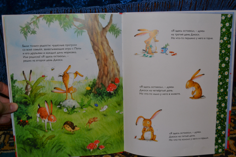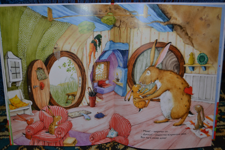 Ну очень уж мне хотелось эту книгу!Выпросила её у свекрови))) Что могу сказать - своих денег она, на мой взгляд, не стОит.Я сама купила бы её не дороже 350 рублей.Формат большой (больше А4), книга сделана очень качественно, иллюстрации своеобразные (не каждому понравятся), хоть и милые.Истории милая, но избитая и предсказуемая.Читать эту книгу мы начали пару месяцев назад.Читали по разу в месяц.Сейчас стали чаще читать, и нам с сыном очень нравится мысль зайчонка Джоси, что почесать за ушком никто не может так, как мама))) Ну, и в конце мы с Димой вместе радуемся возвращению зайчонка домой)))
