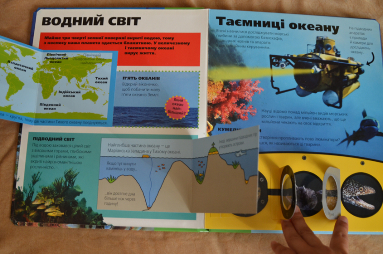 Все книги известные, думаю, фотографировать нет смысла (но если что кому надо - пишите!), покажу ближе случайно купленную пере выездом на море книгу - малый сам к ней потянулся, а я решила, что как раз в тему. Издательство Перо, оно много всего такого делает, не очень я его люблю, но книга понравилась.Информации мало, много окошечек, можно поднимать много вопросов по ней. А эти иллюминаторы на первом развороте!!!