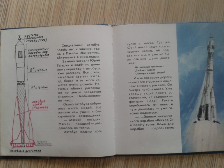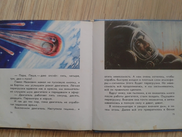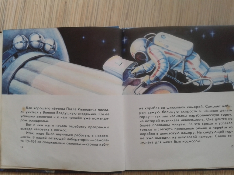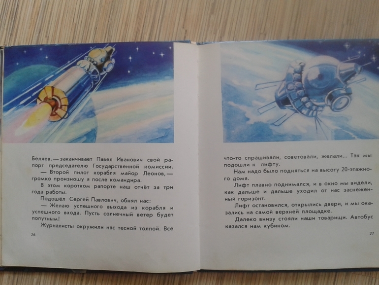 младшим школьникамВсегда завидовала тем, кто у себя на чердаках, в старых шкафах находит книги из детства. Те, которые врезались в память и остались там навсегда. Мои книги разошлись по знакомым-родственникам. И как же я обрадовалась, отыскав на даче вот эту книжку про космос!!! Вернее авторския рассказ Алексея Леонова с его же иллюстрациями о первом выходе человека в космос!!