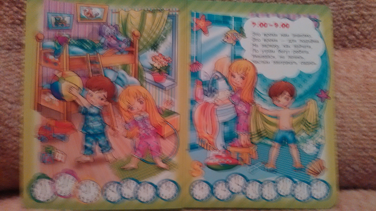 3. Недавно в Fix Price приобрела три картонные книжечки. Мне понравились как стихи, так и иллюстрации. Единственное, что в книжке про мой день, часы не совпадают с тем распорядком, который у дочи в садике, так что я меняю время под ее расписание.