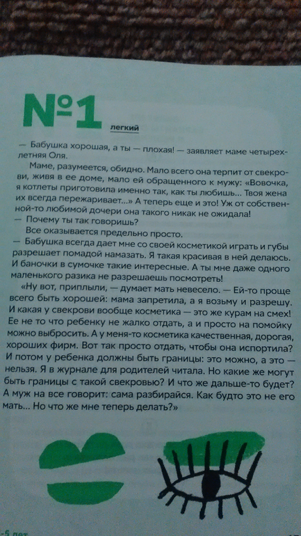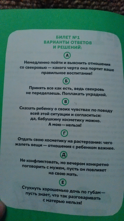Купила по отзывам. В книге три раздела: 2-5 лет, 6-11 лет, 12-16 лет. В каждом разделе по 15 вопросов-ситуаций и варианты ответов к ним. Первые - легкие ситуации с одним правильным ответом, вторые - средние с несколькими правильными ответами, последние 5 - сложные ситуации либо с одним, либо с несколькими правильными ответами, а то и вообще без правильных ответов.