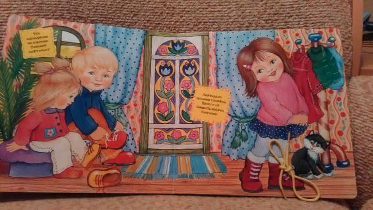 Причем обошлась она мне совсем дешево - рублей 60 кажется. В книге текста минимум, иллюстрации крупные и яркие и главная фишка - какой либо элемент одежды, развивающий навык одевания-раздевания. В книге всего 5 страниц, листы очень плотные картонные. В книге есть пуговица, молния, шнурок и кнопка. Доча побаловалась и забыла. Но, думаю, к шнурку мы еще вернемся =)