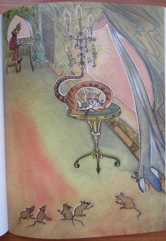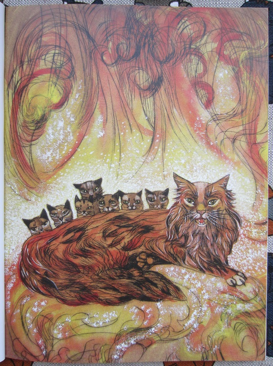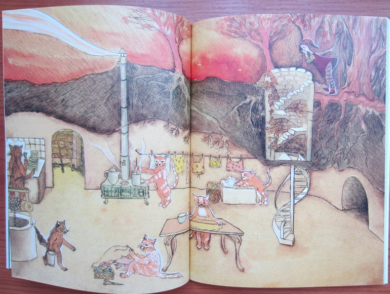Иллюстрации не отталкивали, но нельзя сказать, что понравились с первого взгляда. Кошачий мир французской художницы Патриции Лежандр очень своеобразный, без «уси-пуси». Резкий, угловатый, в то же время грациозный и какой-то завораживающе колдовской. К этим сказкам очень подходит. Ведь и кошки там хитры, вредны, горды.