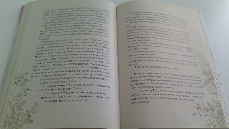 Тёплыми летними вечерами, обнявшись вдвоём, мы целую неделю наслаждались этой уютной и доброй повестью. На мои предложения прочитать про любимого Паддингтона или Серую шейку, дочка отвечала отказом - Мамочка, читай про Поллианну, мне так интересно! И это не смотря на длинные диалоги и описания, на множество новых слов и выражений. Вторую половину книги я предложила пересказывать с картинками, идея дочке понравилась. Без подробностей, но с неугасаемым интересом моя девочка слушала до радостного завершения истории. Странно...., не готова я была читать книги не по возрасту, итак нам пора переходить на более взрослую литературу, срочно купить Девочку с жирафом :))