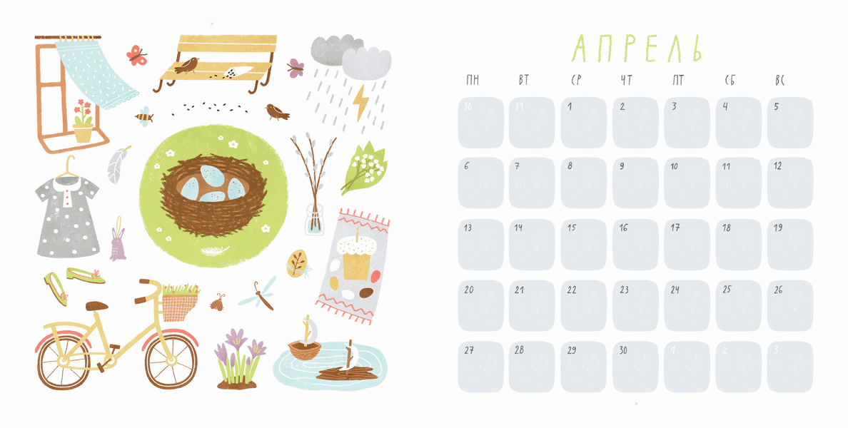 Это большой и красивый перекидной календарь на 2015 год. На его страницах изображены своего рода напоминания и подсказки, что можно сделать в этом месяце, на что обратить внимание, что вспомнить. В календарной сетке удобно делать записи о самых ярких моментах прошедшего дня.2-3 слова (за маленького ребенка с его слов может писать мама).