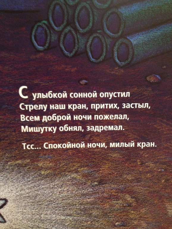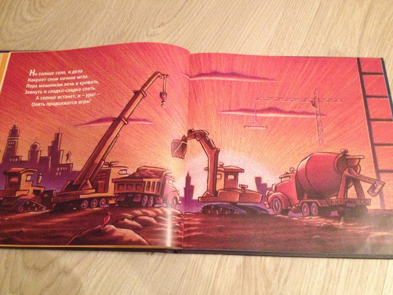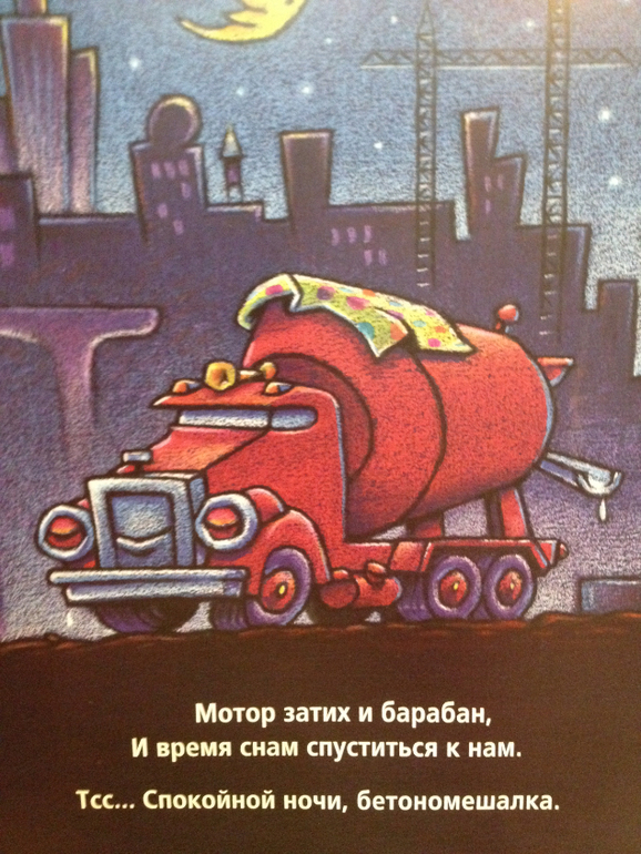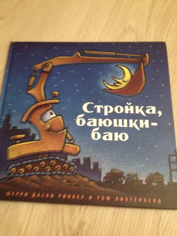 Еще одна часть вечернего ритуала. «Стройка, баюшки-баю». Издательство Карьера Пресс. В книге стихи про то, как строительные машины по очереди укладывались спать. Мне повезло, меня не заставляют читать стихи подряд по пять раз как некоторых мамочек на ББ, я просто листаю и комментирую . Сын закрывает глазки сем машинкам а потом и себе. Очень меня умиляют картинки: кран лег в обнимку с мишкой, бетономешалка укрылась одеялом. Язык очень ласковый, приятный перевод.