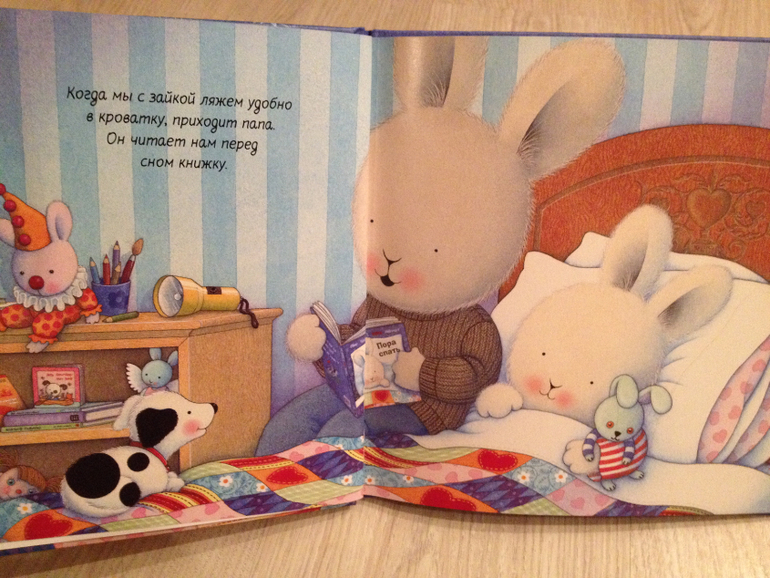 «Пора спать». Серия «Про все, что я люблю». Издательство Machaon. Замечательная книга! У нас часть вечернего ритуала. В книге зайка купается в ванной, одевает пижамку, обнимает маму, приходит папа, читает книгу и говорит трогательный текст как любит своего зайчонка. С тех пор как начали читать эту книгу, сын полюбил одевать пижаму и теперь сам тихо лежит на диванчике и ждет, когда придет папа читать!