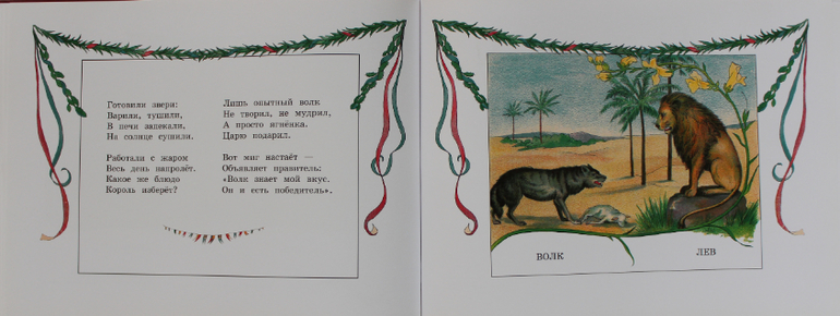 На перебой несут звери свои блюда повелителю, но побеждает, конечно же, волк, который "не творил, не мудрил, а просто ягненка царю подарил."