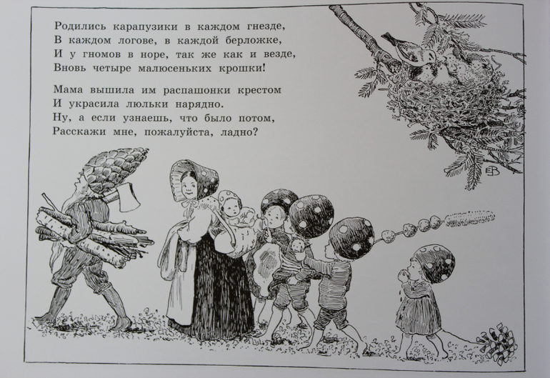 Трогательная история в стихах о гноме и его четырех озорных малышах в колпачках, похожих на мухоморы.