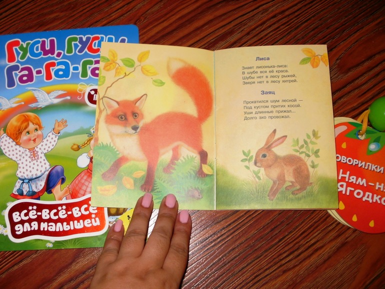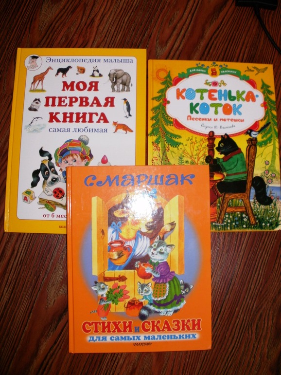 Маршака и Потешки купила. т.к. они из моего детства. Маршака пока не читаем. А потешки начала рассказывать с 2х меяцев. Читаю ей - нравится, гулит. Когда "Про гусей" читаешь уже узнает и смеется) Иногда страницу открываю яркую лежит на нее смотрит.![]()