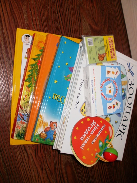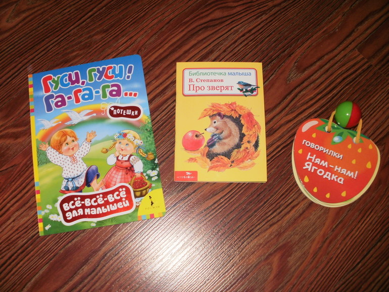 Маленькие книжки: книжку- погремушку берем куда-нибудь с собой, отвлекаем ей. Из этих трех больше нравится "Про зверят" - хотя она менее яркая.![]()