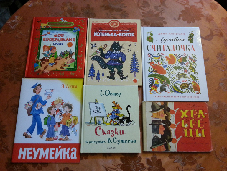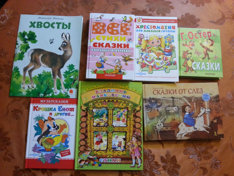 Сборник Сутеева имел оглушительный успех, интерес к нему не ослабевал, правда через месяц ребенок уже исключительно сам выбирал, что из него читать. Неожиданно для меня малыш очень полюбил хрестоматию, сам ее приносил читать. Там довольно приятные иллюстрации, есть 3 рассказа про Машу и Ойку, благодаря этой книге я поняла, что Прокофьеву надо будет брать. Сказки от слез помогали нам не раз. И физиотерапия и даже измерение температуры, не говоря уж о чтении на ночь, были пройдены с этой книжкой. Книжка же про Крошку Енота убила меня некачественной версткой, в ней перепутаны местами куски текста, интересно, кто-то еще это заметил? Но я уже приноровилась и у ребенка эта книжка все равно в фаворитах.