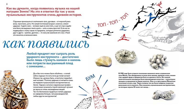 В издательстве Арт-волхонка выходит интересная книга "Бей в барабан и не бойся!". Книга рассказывает о рождении ударных в каменном веке, о тамтамах, думбеках, бонго и литаврах, о том, как устроен барабан и как на нем играть, и о том, что стучать можно даже без барабана - самые неожиданные предметы в руках человека превращаются в ударные инструменты и о многом другом. Все об ударных инструментах, их древнем происхождении, захватывающем прошлом и удивительном настоящем.