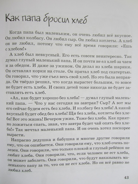 Мнение о том, что все рассказы должны быть с воспитательной подоплёкой и назидательным финалом очень спорно. Я ближе к тем, кто говорит, что Мама и Папа - это такие же люди, они тоже могли ошибаться, и ребёнку интересно будет узнавать об этом. И выводы он сделает сам, а уж какие - это зависит не от одной книги, а от системы воспитания в целом и от взаимоотношений в семье…