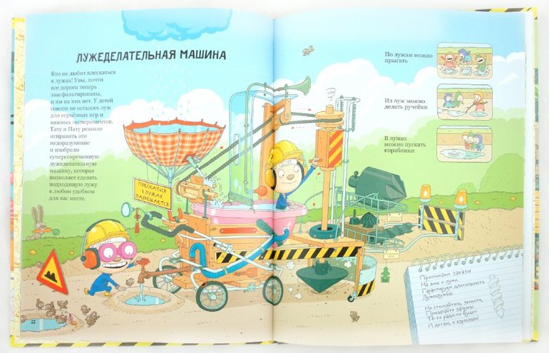 Братья Тату и Пату смотрят на мир, как пришельцы из космоса, для них все вокруг новое и неизведанное. Вместе с детьми они открывают и изучают окружающие явления и предметы. Неутомимые Тату и Пату придумали четырнадцать странных, но крайне полезных изобретений, которые, без сомнения, пригодятся любому ребенку и его семье. Да и разве можно представить себе утро без будильно-кормильно-одевального аппарата, прогулку без лужеделательной машины, а обед без всякобяко-определителя?
