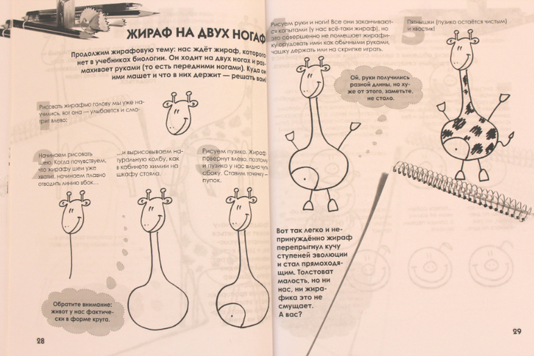 Как человек, умеющий рисовать красиво домик, солнышко да кораблик, на этом моя фантазия иссякала, я в полном восторге от книжечки. Пошаговая схема для создания рисунков животных: котики, зайчики, жирафы, ежики, коровы... Очень просто и очень быстро, на самом деле, даже меньше 30 секунд! И любое животное "выходит" из под Вашего пера прямо как у именитого детского иллюстратора)))