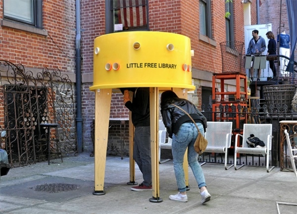 Маленькую бесплатную библиотеку (Little Free Library) придумали дизайнеры студии Stereotank. Это государственный проект, обеспечивающий жителям Нью-Йорка возможность почитать прямо на улице, сидя в кафе или в парке. Библиотечная будка представляет собой пластиковый контейнер желтого цвета с маленькими круглыми окошками. Там можно бесплатно взять книгу, но обязательно ее вернуть, чтобы маленькая библиотека не опустела.