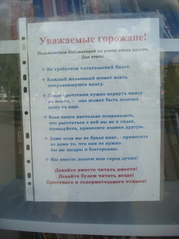 Вот такие библиотеки есть во многих городах мира, а у нас, а у НАС... позади осталась теплая весна, прошло лето и вот в начале осени в нашем городе, НЕ ЖДАННО, НИ ГАДАННО, появилась библиотека на улице! Выглядит она конечно очень-очень скромненько, но лиха беда - начало!