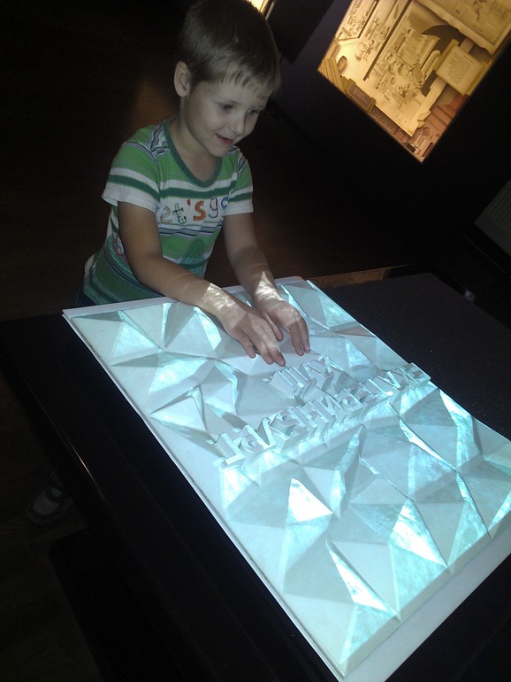Еще очень понравился интерактивный стол. Это что-то вроде летописи известных личностей нашего города - почетные граждане Екатеринбурга за всю его историю - есть и фото, и заметки/вырезки из газет, фотографии. Вот сыну показывали Владислава Крапивина: