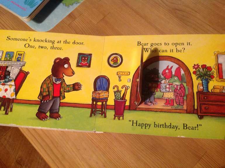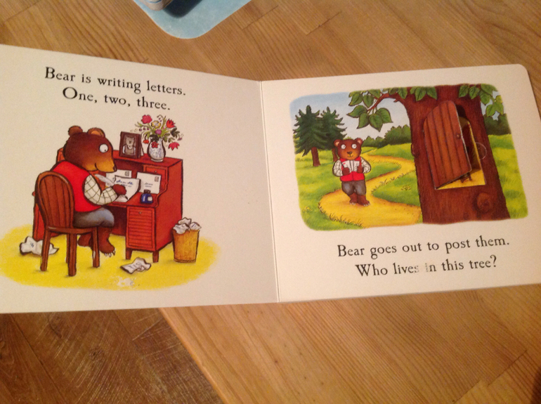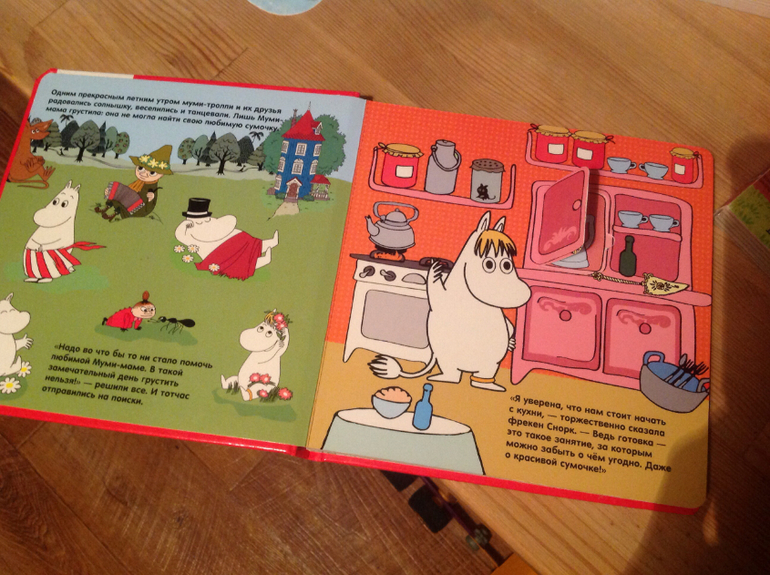 Очень нравятся книжки с окошками. Безусловный хит с 10 мес и до сих пор книжка про Мумми тролей. Еще очень нравятся книжки с иллюстрациями Алекса Шифлера. Особенно про медвежонка, который всех приглашал к себе на обед. Еще периодически просыпается любовь к книжкам с двигающимися элементами - про город и про мишку на стройке, но все равно окошки - это наше все)))) далее несколько разворотов из выше перечисленного
