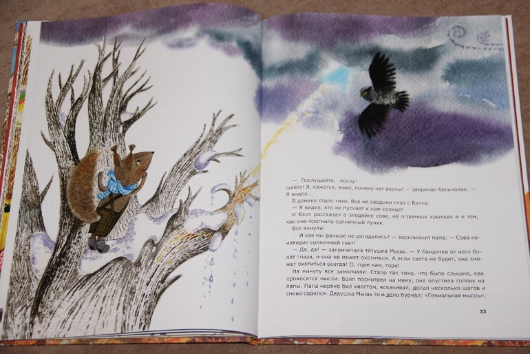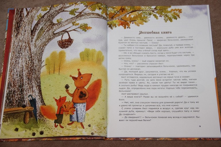 Я почему то думала, что эта книга вроде Дук-ду на возраст примерно около трех лет. А в отзывах люди пишут, что читают в пять и даже в 7-8 и нравится, вот и достала сыну почитать. Название интригующее, лично мне все очень понравилось и сюжет, и иллюстрации замечательные. Бельчонок находит в гнезде аиста, который улетел на юг, волшебную книгу и решает стать настоящим волшебников, только все у него идет не как он задумал: ореховое дерево вырастает не во дворе, а в его собственном дупле, а "чуть-чуть желудей, чтобы протянуть до весны" оборачивается просто стихийным желудевым бедствием, таким, что завалы пришлось разгребать лопатами.