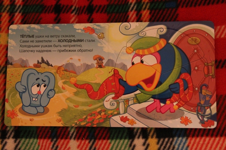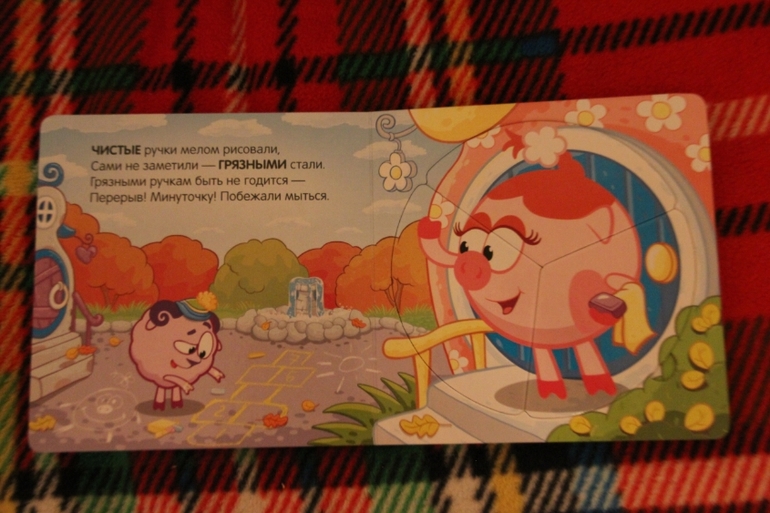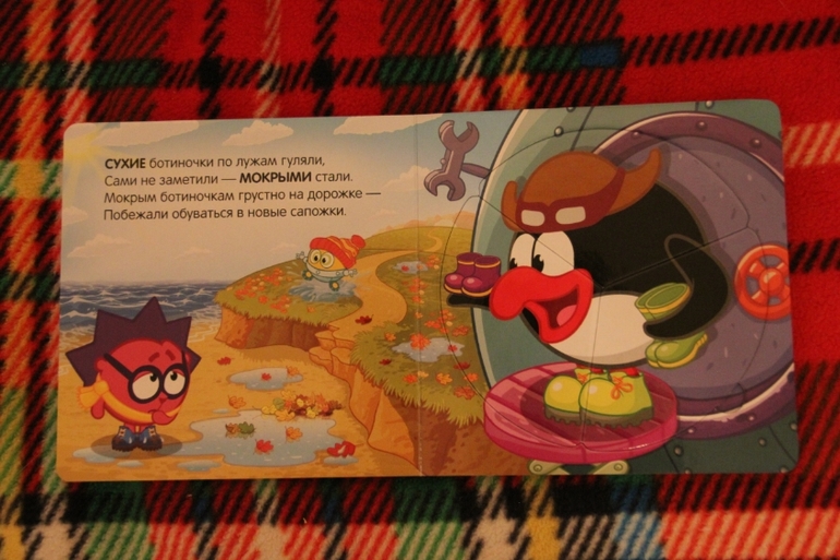 Еще сегодня знакомились с книгой- пазлом изд. " Умная Маша" серия Смешарики " Все наоборот". В книге всего 4 разворота, на каждом по пазлу. Нам очень понравилась.