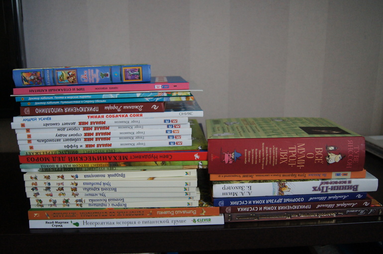 Книги разложены в две стопочки, в левой, которую читаем с удовольствием, ну или хотя бы не отказывается прочитать ребенок, а вот правая пока никак не пошла, но мне кажется просто рановато, рассчитано на более старший возраст детей, через полгодика достану.