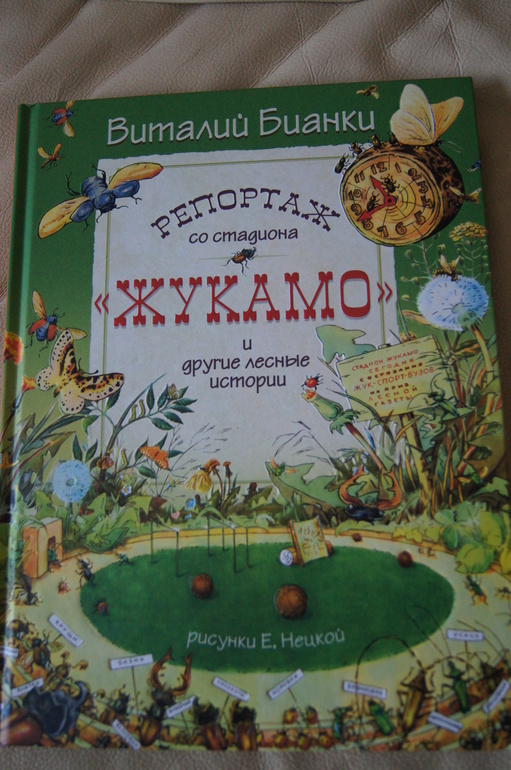 "Репортаж со стадиона "Жукамо"" Виталий Бианки. Ребятенку моему мало "экшена" в этой книге, ну и в который раз удостоверилась, что более реалистичные рассказы про животных/птиц/насекомых/людей оставляют сына равнодушным.