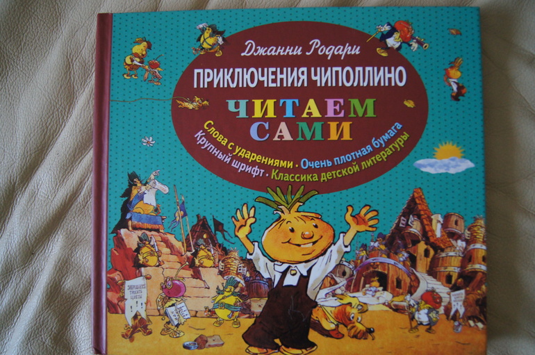 "Приключения Чиполлино". Все, зареклась больше брать краткий пересказ более длинных книжек, вообще ничего не понятно в этой книге, но очень красочные иллюстрации и по мотивам советского мультфильма.