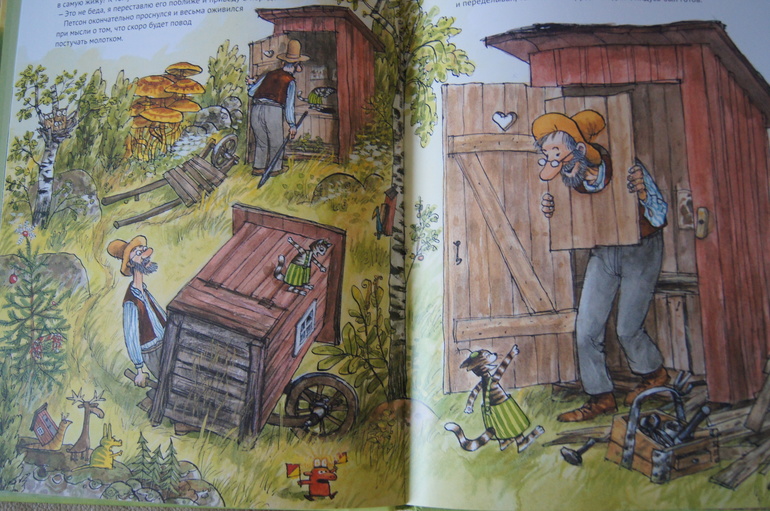 В продаже появились новые книги про Финдуса, я купила больше для себя, для коллекции, т.к. судя по аудисказкам, ну и потом подтвердилось практикой "Финдус переезжает", "Петсон идет в поход" и т.д. сыну не очень-то и нравится. "Механический дед мороз даже не читали, рассчитан на деток постарше. Немножко шокировала одна иллюстрация в книге "Финдус переезжает", когда Петсон одел доску с дыркой от туалета. Я бы и за сто миллионов (вру, за сто миллион одела бы, ну даже чуть меньше) не одела эту доску, т.к. у бабушки в деревне такой же уличный туалет был, до сих пор помню с каким содроганием я туда ходила балансировать над дыркой.)))
