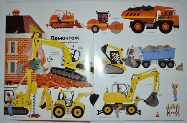 Тут все - демонтажная и строительная техника, уборочная и сельскохозяйственная, пассажирский транспорт, грузовой, пожарные машины, морской транспорт, авиатранспорт, и, (супер-мега-вау!) ракеты! Сколько разнообразных фишек - и колесики крутятся, приводя в движение бетон в бетономешалке и зерно в комбайне, и можно помочь строителю подняться с земли в кабину башенного крана, заглянуть внутрь трейлера и посчитать чемоданы в багажном отделении автобуса - все крутится, вертится, поднимает и опускается, едет вперед и назад!
