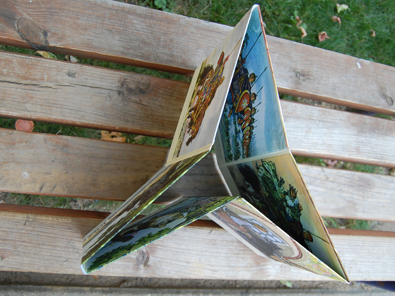 Вернемся к иллюстрациям. По пожелтевшим страницам было невозможно определить первоначальные цвета, так что нам пришлось восстанавливать их заново, исходя из цветовой гаммы, присущей творчеству художника. Книга напечатана на плотном картоне, соединения между страницами дополнительно упрочнены. Благодаря тщательно выверенному расстоянию между картонками, книгу можно легко сложить и разложить ширмой или треугольником.