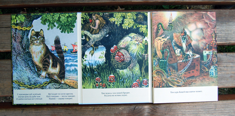 Обложка радует нас бурной зеленью роскошного Дуба. Вся честная компания уже в сборе - и кот ученый, и Баба-Яга в ступе, и леший.