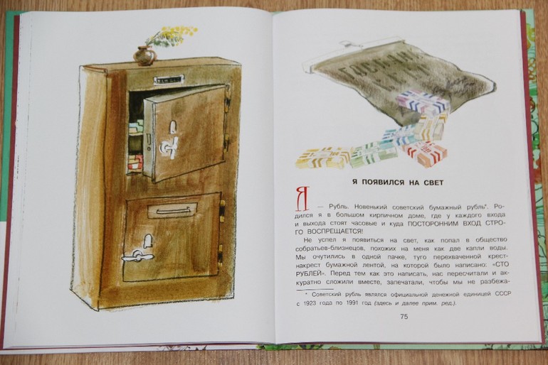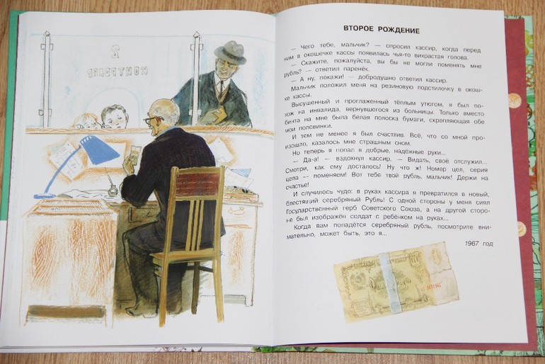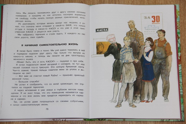 Теперь немного о сказке. Я раньше о такой даже не знала, прочитала первый раз. Как бы ей конечно тут немного не место, она во-первых очень советская и современным детям по ней можно разве что об истории советского союза рассказывать, а во-вторых мне не очень понравились некоторые моменты. Например, рассказывается про пьяницу, который пропил этот рубль и потерял или момент упоминается, когда рубль суют в руку (то есть дают взятку). А вообще сказка о том, какова жизнь рубля от момента, когда его получил рабочий в качестве зарплаты и до момента когда он так потрепался, что его снова сдали в кассу и обменяли на новенький. Подросшим детям наверно лет 5-7 можно читать ее как вводную для последующего разговора о деньгах ))