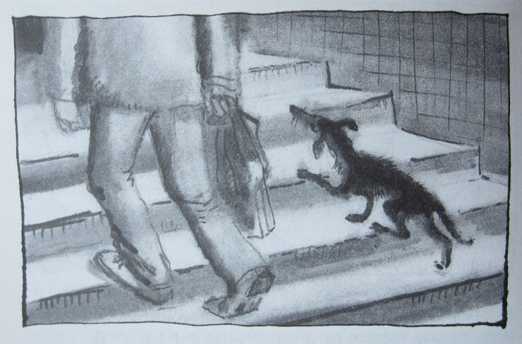 … он увидел перед собой открытую дверь, из которой вкусно пахло рыбной похлёбкой. Комната, куда он вошёл, была пуста. В ней тоже всё было знакомо ему по свалке. Такая же мебель. Разве что здешняя (гардероб, диван, телевизор, буфет) чинно стояла вдоль стен и была в довольно хорошем состоянии. «Значит, вот что такое дом, подумал Пёс, - это свалка, приведённая в порядок».