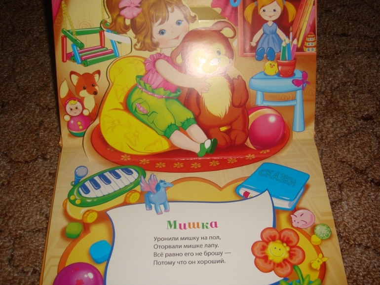 Хвастик (показываем книжные покупки)Очень милая книга со стихами Барто "МИШКА". Это книжка - панорамка. На каждом развороте рисунок и стишок. Всего в книге 5 разворотов. Мне кажется книжка очень подходит для первого знакомства малыша с творчеством Барто. Картинки сочные, красочные. Прорисовано все очень хорошо и нет ощущения компьютерных иллюстраций. Обложка очень плотная. Листы тоже крепкие. Моей малышке понравилась.Сидели вечером рассматривали животных, цветочки, игрушки.. Смотрите сами..