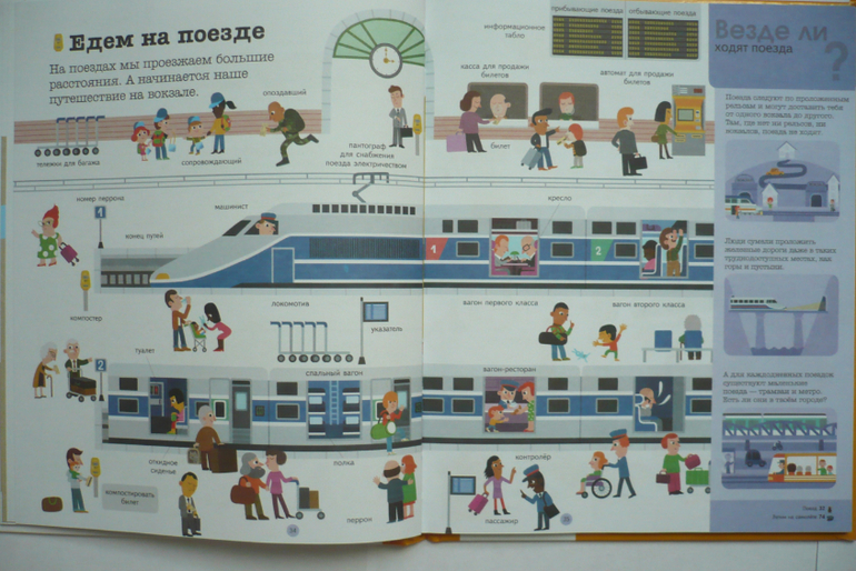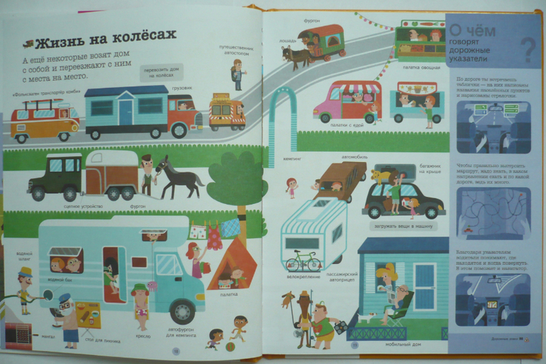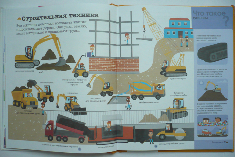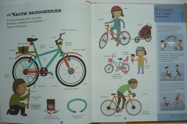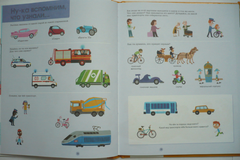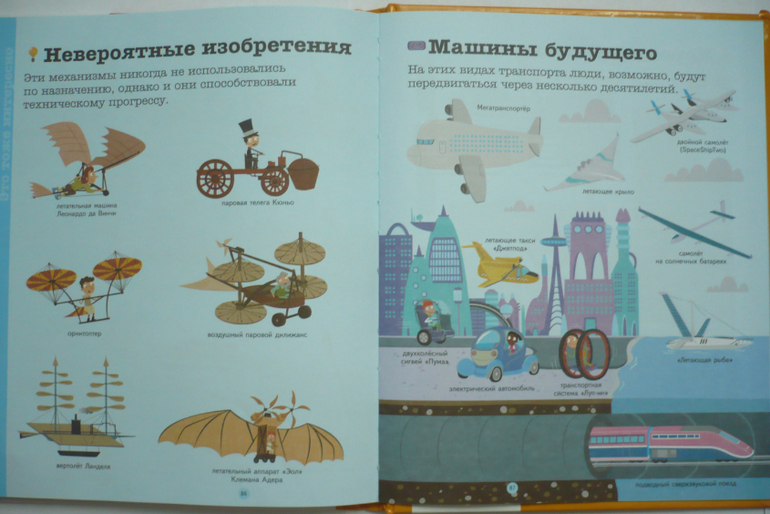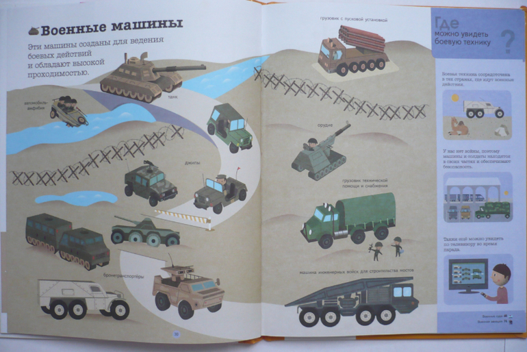 В книге три раздела: на земле, на воде, в воздухе. Весь транспорт разбит по категориям и для каждой категории целый разворот (например, военная, строительная техника, моторные, рыболовные суда и др.). В книге рассказано об устройстве разной техники (части автомобиля, велосипеда, самолета и др.). Здесь собрана интересная информация (например, что такое гусеницы, как летает самолет, зачем нужен винт и мн. др.). Каждый раздел книги заканчивается вопросами по теме. Один разворот посвящен дорожным знакам. В конце есть алфавитный указатель.