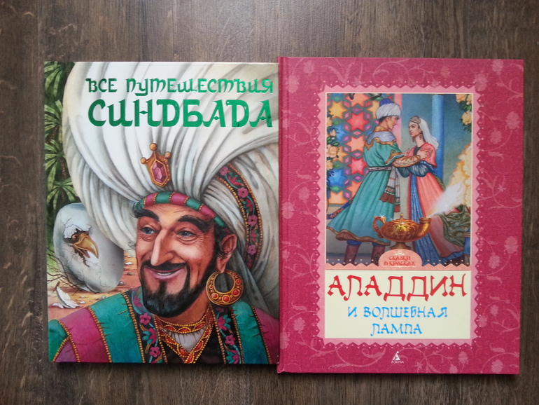 Синдбад понравился, слушал открыв рот, старший попал на чтение одной из историй взял тоже читать, прочитал всю, но сказал что слишком детская (мне совсем так не показалось). Алладина еще не читали. Купила случайно в магазине канц товаров за 100 рублей.