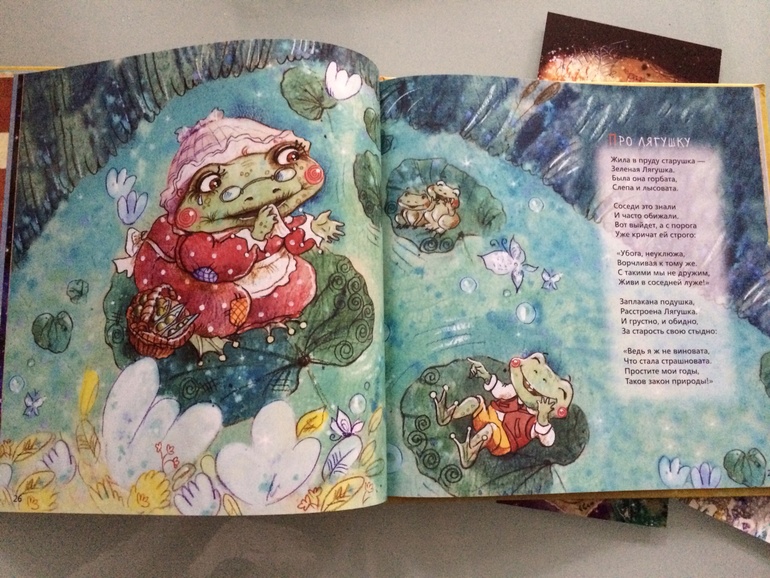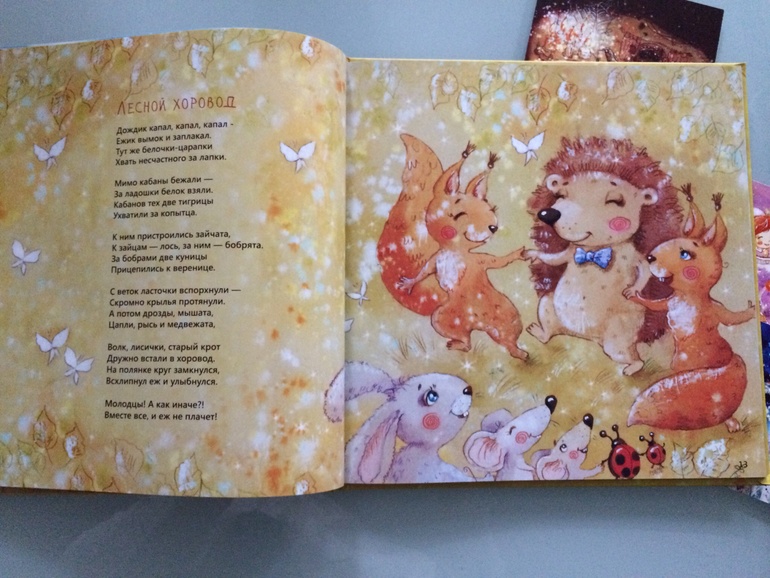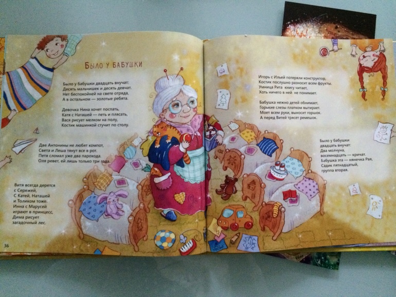 Всего в книге 22 разворота со стихами, стихи все не большие, самое большое стихотворение "Было у бабушки"(картинку разворота я как раз вставила). Но все стихи очень теплые и нежные и какие то очень светлые.