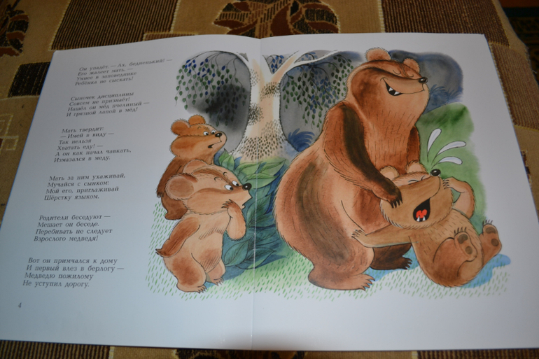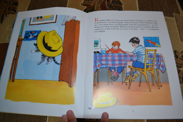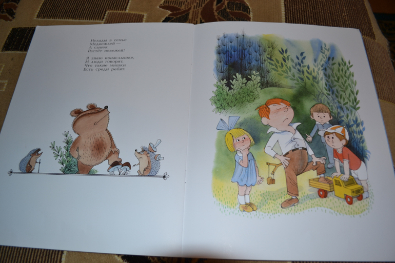 Эта книга появилась у нас, когда сыну было 2 года, и сразу же стала одной из любимых.Мне это стихотворение нравится гораздо больше в иллюстрациях Чижикова, чем в иллюстрациях Сутеева.Тут герои как-то смешнее, добрее выглядят.Даже папа, который "отшлёпал сорванца", на такой страшный.В таких же иллюстрациях это стихотворение у нас есть в сборнике "Про Вовку, кошку и черепаху", но там иллюстраций меньше и они не всегда идут соответственно тексту, а у М-П в этом плане просто идеально всё!Однако и тут нашлась "ложка дёгтя": на самой первой странице опечатка!Вместо предлога "для" напечатано "дл".Согласна, это было бы не столь важно, если бы речь шла не о М-П.Но от этого издательства даже как-то и не ожидала опечаток...