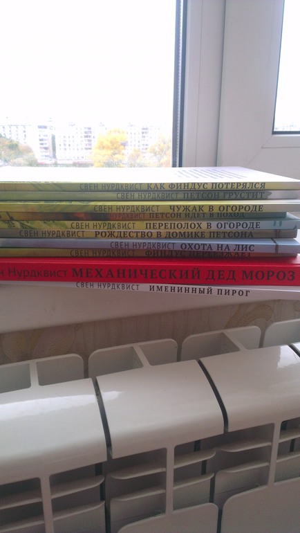 дошкольникамНа днях попросила жену брата дать нам на пробу одну книжку про Петсона и Финдуса. Она как-то давно мне их нахваливала, но мне было не очень актуально, так как старший только родился. Сейчас решила опробовать, попросила одну. Думала, если пойдет - куплю все остальное. Вчера брат звонит в дверь. в руках пакет - они нам купили в подарок всю серию. Я в обмороке-))