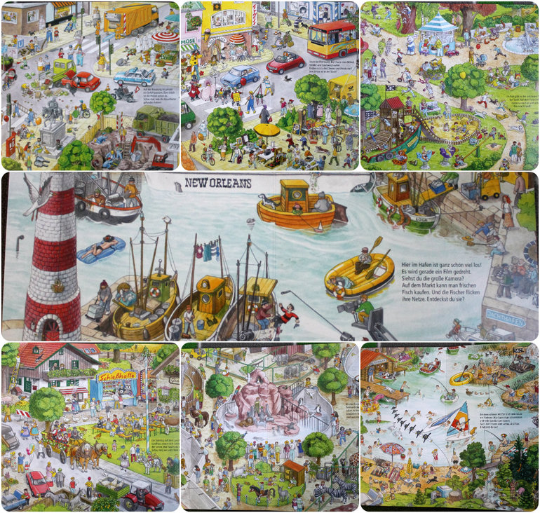 О книгах этого жанра я узнала именно благодаря данному сообществу когда Мишане не было и года, и я подумала а почему бы и нет надо приобщаться к чему то новому. Wimmelbuch - это книжки-картинки, где собраны многочисленное количество деталей, персонажей, предметов и действий, даже порой в книге очень отчетливо видны эмоции, а самое прекрасное то что эти книги можно рассматривать бесконечно, находя на каждом развороте все новое и новое. Очень жаль что в России очень мало можно найти книг данного жанра, правда в последнее время на известных мне интернет магазинах стали появляться все новые и новые книги. И вот в итоге какие книги появились на нашей полке.